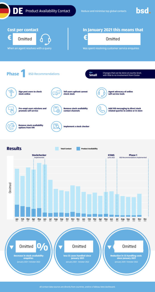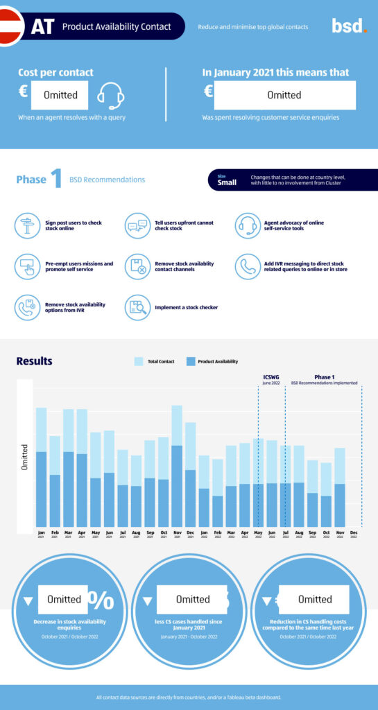 The images shown here are case studies for 2 of the countries that had implemented the teams suggestions, showcasing the impact on the CS contact and cost saving for the business. The case studies have had all sensitive data omitted for display purposes.