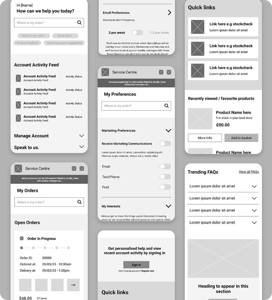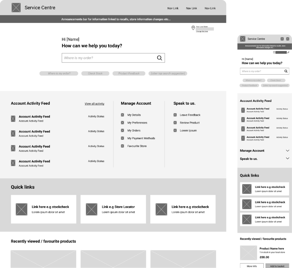 After understanding the business and customer requirements, we created initial wireframes for each section of the Service Centre, including logged in/non-logged in states, landing pages, etc..